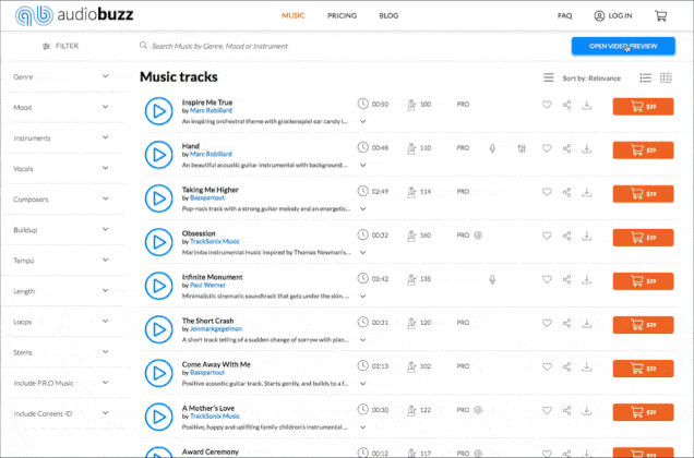 Check out our Video Preview tool!Upload your video instantly and match it with selected tracks in real-time to find the right music faster. An Industry first. Only on Audio Buzz. | |